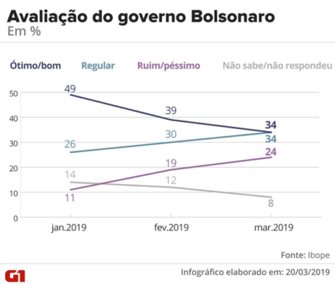 Pesquisa Ibope divulgada nesta quarta-feira (20) mostra os seguintes percentuais de avaliação do governo do presidente Jair Bolsonaro (PSL):